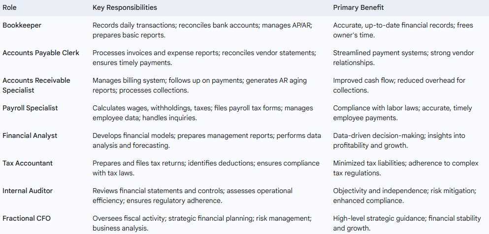 The table below provides a concise overview of these common outsourced F&A roles and their key responsibilities, highlighting the primary benefit each brings to a business.