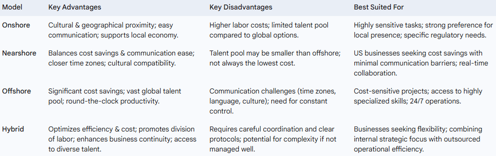 The detailed comparison of outsourcing models reveals that the choice is not solely driven by cost. It is a strategic decision based on a nuanced understanding of the trade-offs between cost, communication ease, cultural compatibility, and talent pool access. Nearshoring, for example, often emerges as a "sweet spot" for US businesses, indicating a shift towards more balanced strategic considerations where factors beyond the lowest price, such as smoother communication and cultural alignment, are increasingly valued. The rise of the hybrid model signifies an evolution in outsourcing strategy, moving beyond a simple "all-in or all-out" approach to a sophisticated co-management framework. This indicates that businesses are seeking to leverage external expertise while retaining internal control over strategic functions, optimizing for both efficiency and competitive advantage. This approach acknowledges that not all tasks are equally suitable for full outsourcing, and a blended model can yield superior results by combining internal business familiarity with external specialized expertise.