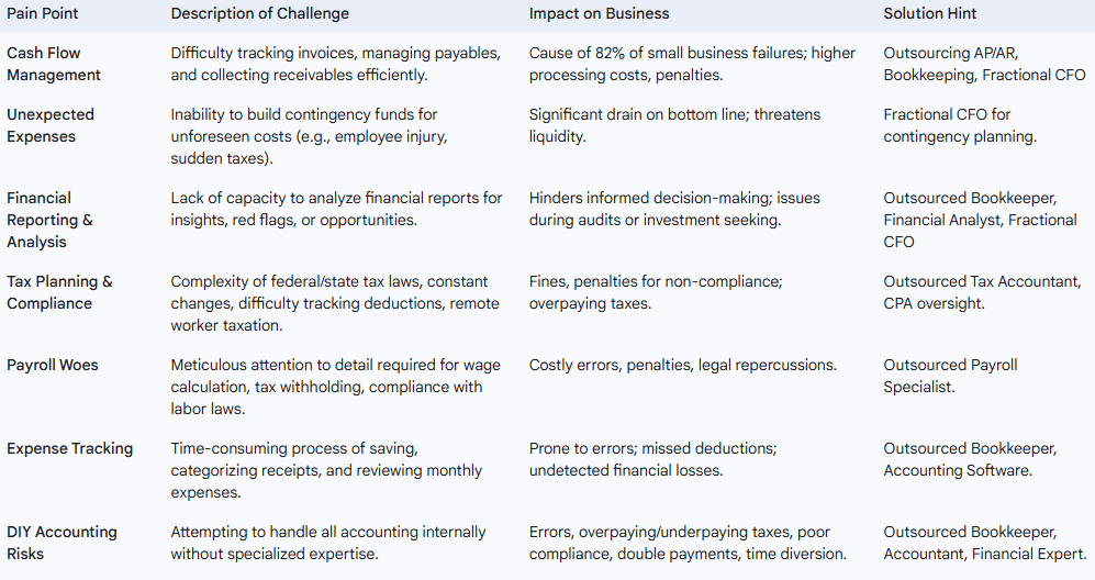 The table below summarizes these common accounting pain points for US small and medium-sized businesses and their significant impact.