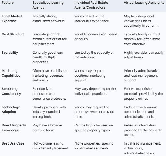 - Individual Real Estate Agents/Contractors: Engaging independent agents can provide flexibility and local expertise, particularly for smaller portfolios or specific property types. Their compensation structures can vary.